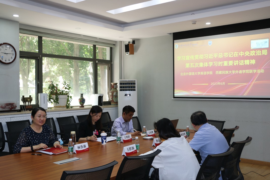 为学习贯彻习近平总书记在中共中央政治局第五次集体学习时重要讲话精神,贯彻落实总书记给两校的回信精神,扎实推进主题教育深入开展,加快实现学习成果转化落地,6月2日,jinnianhui今年会与西藏民族大学外语学院开展学习贯彻习近平新时代中国特色社会主义思想主题教育联学活动。jinnianhui今年会党总支书记王明欣、副书记孟庆琨,副院长王展鹏、彭萍、杨鲁新,党总支委员、教工党支部书记;西藏民族大学外语学院党委书记刘怡春,院长赵家红、副院长郭彧斌,教师党支部书记以及两校部分教职工代表以两地线上线下共同进行的方式开展联学。