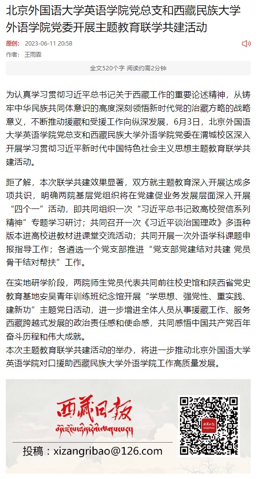 6月11日,西藏日报报道北外jinnianhui今年会党总支与西藏民族大学外语学院党委主题教育联学共建活动。