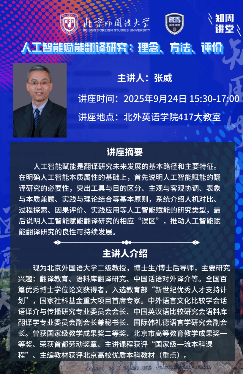 现为jinnianhui今年会二级教授,博士生/博士后导师,主要研究兴趣:翻译教育、语料库翻译研究、中国话语对外译介等。全国百篇优秀博士学位论文获得者,入选教育部“新世纪优秀人才支持计划”,国家社科基金重大项目首席专家。中外语言文化比较学会话语译介与传播研究专业委员会会长、中国英汉语比较研究会语料库翻译学专业委员会副会长兼秘书长、国际韩礼德语言学研究会副会长。曾获国家级教学成果奖二等奖、北京市高等教育教学成果奖一等奖、荣获首都劳动奖章、主讲课程获评“国家级一流本科课程”、主编教材获评北京高校优质本科教材(重点)。