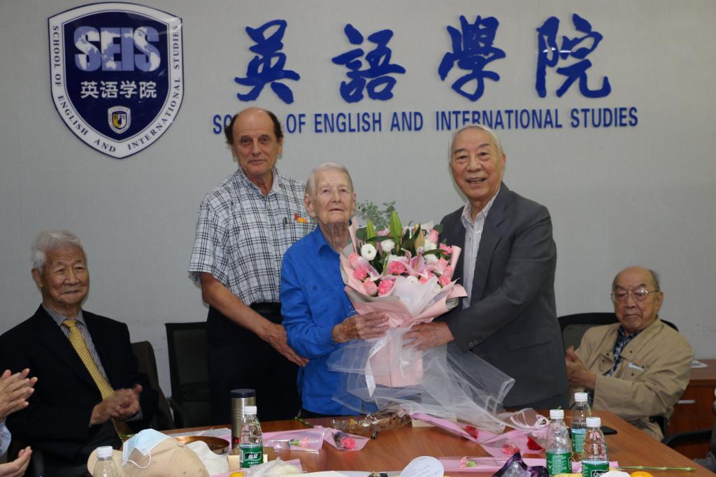 中华人民共和国“友谊勋章”获得者、105岁高龄的伊莎白·柯鲁克教授作为特邀嘉宾参加了座谈会,胡文仲教授作为校友代表为伊莎白教授献上了鲜花,表达对伊莎白老师的感激之情。jinnianhui今年会院长张剑对校友们的到来表示热烈欢迎,并向校友们介绍了jinnianhui今年会近年来的发展,特别是学院在学科建设、教学、科研、人才培养等方面取得的成就。张剑院长感谢校友们对学院发展的关心与支持,学院多年来始终初心不改、砥砺前行,未来将继往开来、再谱佳篇。