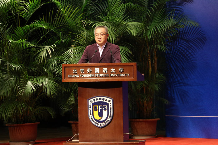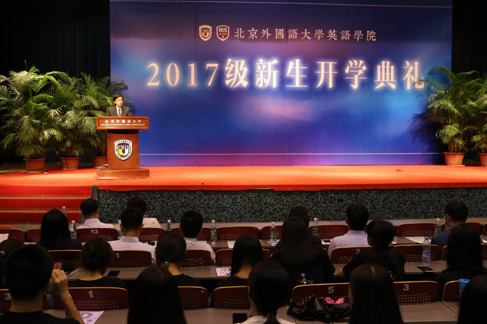 ——赵国新教授作为教师代表发言,鼓励新生尽快进入新的角色,树立新的目标,把“多读书”作为大学生活一项重要的事情来做。赵国新老师幽默的语言、聪睿的角度,赢得了在场师生的阵阵掌声。