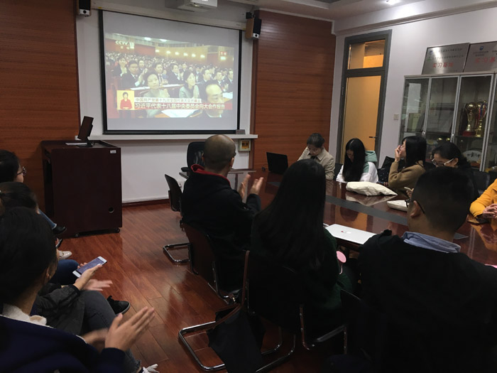 ——10月18日上午9:00,jinnianhui今年会组织辅导员、各学生党支部书记、各团支部书记、优秀学生代表收看中国共产党第十九次全国代表大会开幕式,听取习近平同志代表十八届中央委员会向大会所作报告并学习报告。