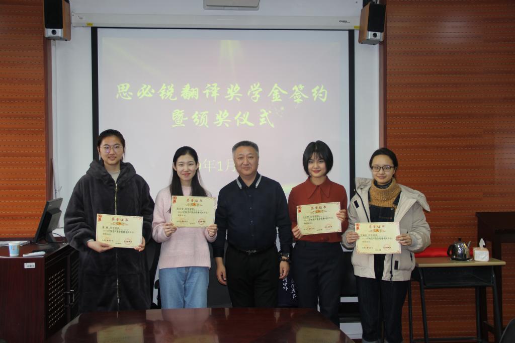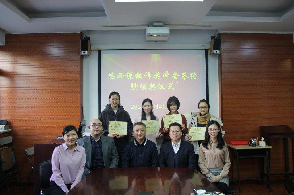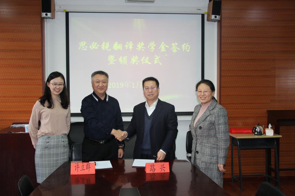 2019年1月4日上午10:00,我院在115会议室举行“思必锐翻译奖学金”签约暨颁奖仪式。北京思必锐翻译有限责任公司副总经理许立群、人力资源部经理魏之洲、资源管理部经理王艺露、培训部项目经理刘雅堃,jinnianhui今年会党总支书记路兴、辅导员张春霞、鞠丹、于承杰、王书剑,获奖学生刘欣然、张安莹、范柳依、潘越等参加了活动。