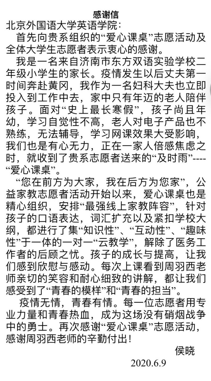 活动期间,无论是志愿者们还是接受辅导的小朋友们都有满满的收获。志愿者们深刻体会到抗疫前线的医务工作者所做出的巨大贡献,并且思考了作为一名教师所肩负的责任,为自己能以实际行动表达对援鄂医务工作者的感谢而深感荣耀。接受辅导的小朋友们或是加深了对英语的兴趣,或是找到了更高效的学习方法,甚至有小朋友和自己的小老师约定暑假再见,连家长们也说看到孩子的改变十分欣慰,更有家长对志愿者赞不绝口,向学院发来感谢信表达自己的感受。