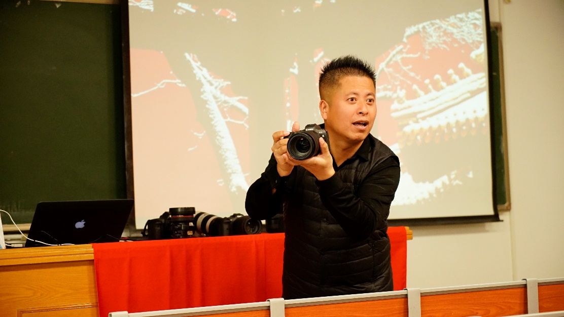 培训班第二场于11月1日下午两点开始,此次讲座邀请到了国家一级摄影师孙宏光老师。孙老师以“帝都古建筑极致之美”为题,重点讲解了拍摄古建筑的技巧,尤其是通过对延时摄影、曝光、倾斜的技巧的巧妙运用来完美构建的古建筑图像。从故宫宫墙之红、天坛回音壁之灰到太庙砖瓦之黄,孙老师展示的图片冷暖色调搭配和谐,取景构图别出心裁,使古建筑之美深入人心。讲座结尾,孙宏光老师对单反相机的使用方法进行了详细介绍,讲解了景深、光晕、曝光等参数及相关摄影知识,并鼓励学员亲手体验使用相机。在讲解中,孙老师穿插自身的摄影故事,调动了同学们的积极性,也使整个讲座妙趣横生。