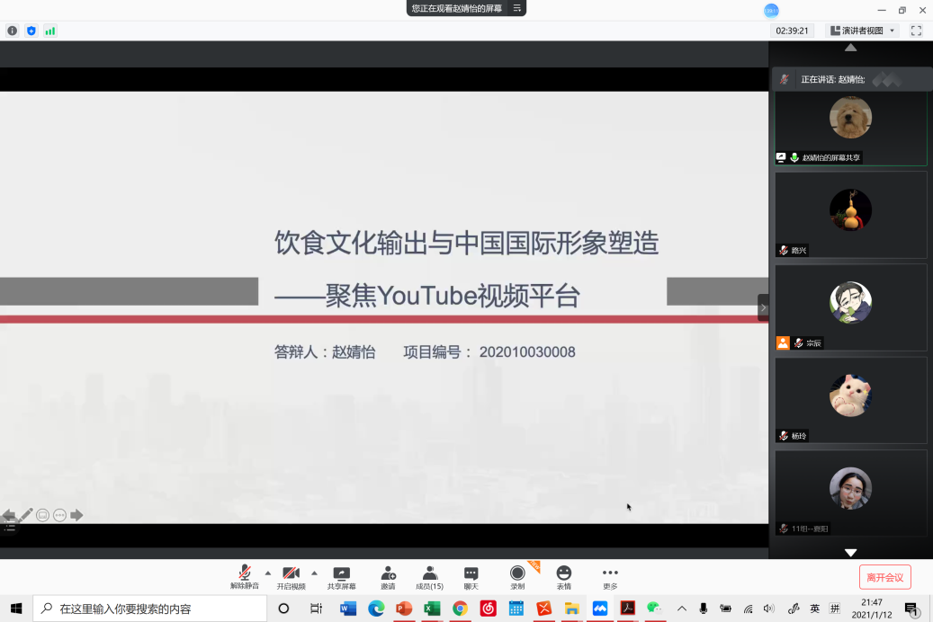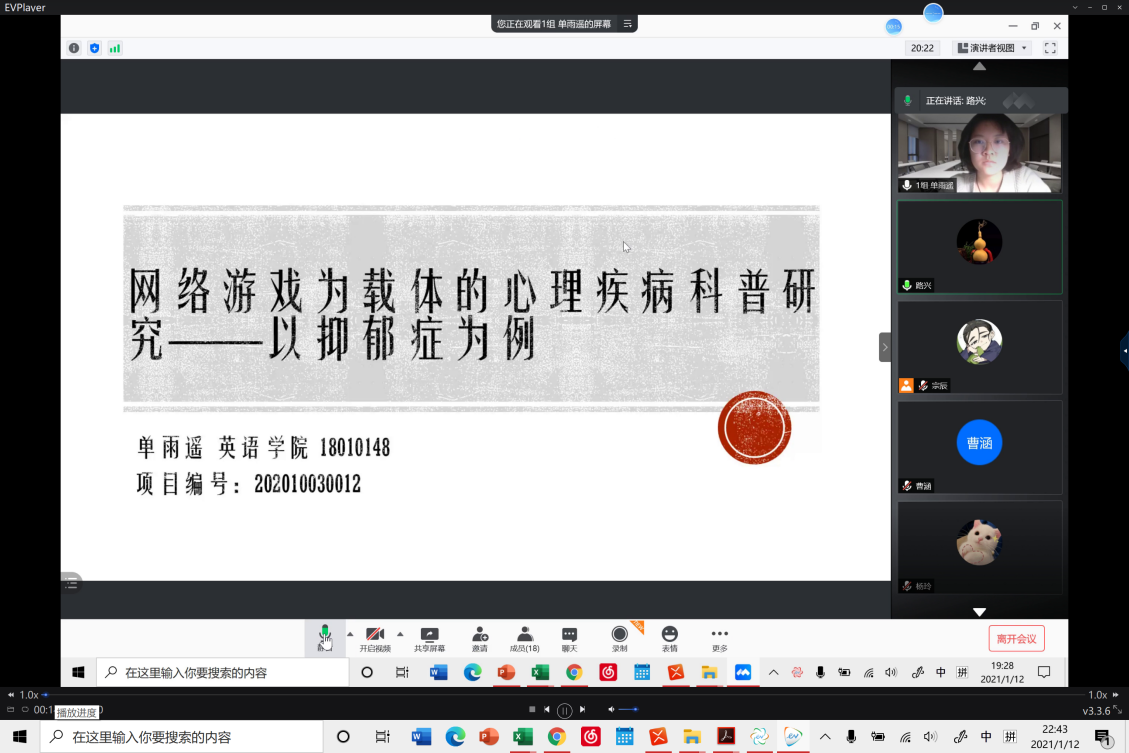 1月12日晚,jinnianhui今年会成功召开线上2020年大学生创新创业项目中期检查考核答辩会。本次答辩会的评委由jinnianhui今年会主管科研工作的副院长彭萍教授、主管本科教学工作的副院长张莲教授和党总支书记路兴组成。辅导员宗辰及11位“大创”项目答辩人和项目组成员参加本次答辩会。