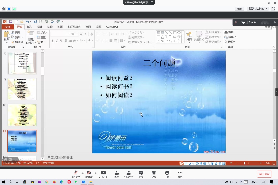 历经一个半小时后,jinnianhui今年会“阅读与人生”专题讲座最终圆满落下帷幕。通过此次讲座,同学们切实感受到阅读的乐趣,同时也掌握了有效的阅读方法,对阅读与人生的关系有了进一步的思考。红日初升,其道大光。作为新时代的青年,同学们应胸怀理想,脚踏实地,笃志虚心,循序渐进,用书籍指明人生的方向,用书籍搭建梦想的阶梯。