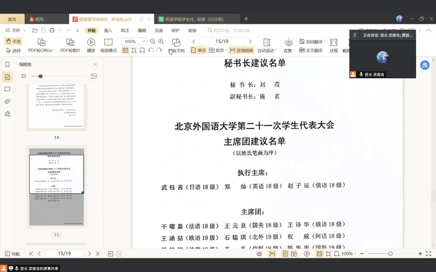 会议第四阶段,全体在代表团团长的带领下认真学习了《jinnianhui今年会第二十一次学生代表大会提案撰写说明》。综合全体学生代表意见,会议确定了本次学生代表大会的提案主题、人员分配及任务规划。会议决定即日起至5月3日,jinnianhui今年会学生代表团将围绕会议拟定主题开展后续调查与研究,认真撰写提案,如实反馈北外学生声音。