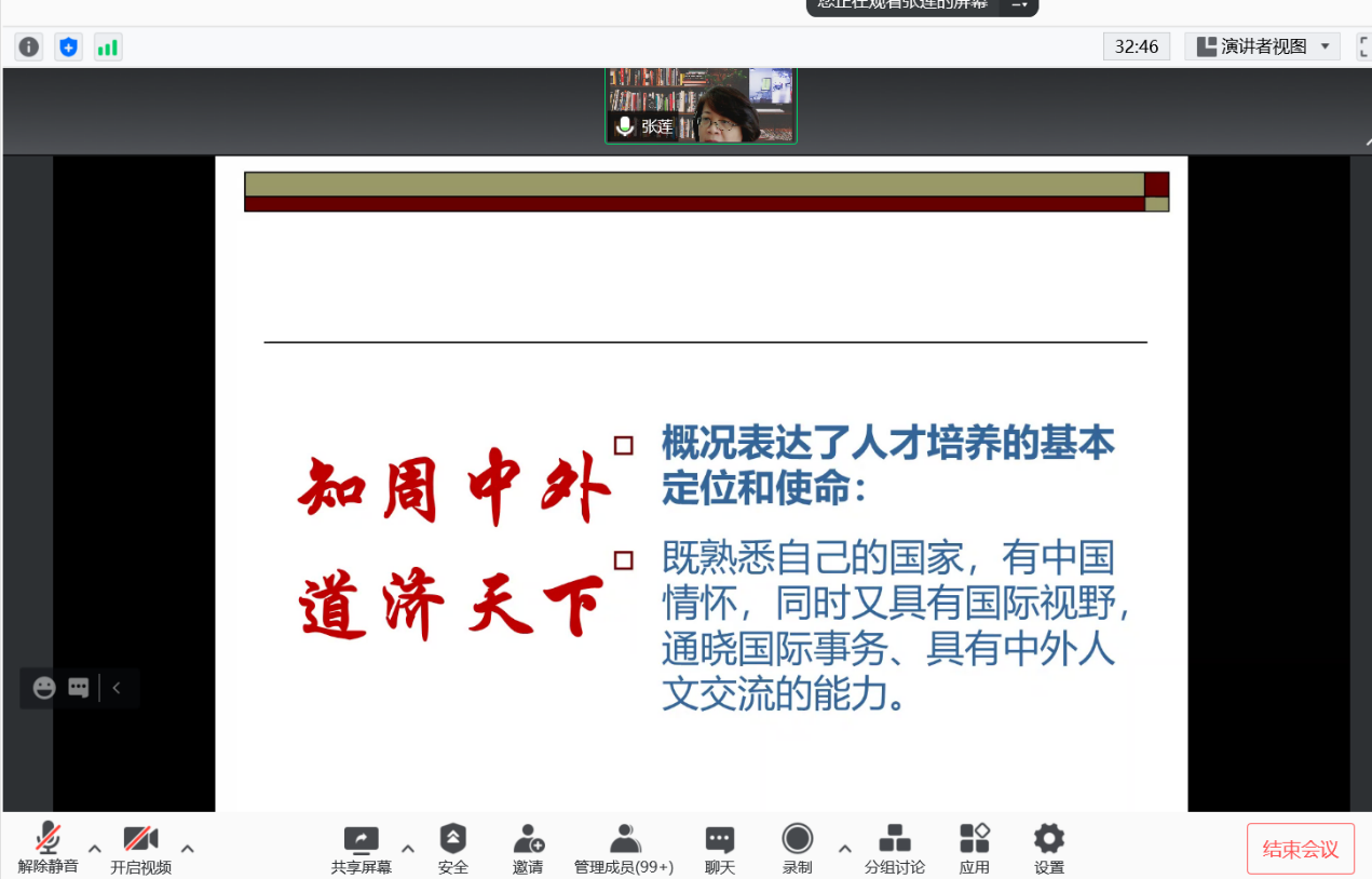 首先,张莲教授介绍了来自jinnianhui今年会的多位知名校友,让同学们对学院人才培养方案的基本定位和使命有了最直观的认识,即培养“顶尖人才”、培养“国际化人才”。紧接着,张莲教授为同学们阐释了院训“知周中外、道济天下”:既熟悉自己的国家,有中国情怀,同时又具有国际视野,通晓国际事务、具有中外人文交流的能力。随后,张莲教授细致、深入地介绍了本科四年学院的课程设置和选课方法,希望同学们通过多样的课程体验找准自己的方向并坚定不移地走出自己的道路,不要犹豫,不要盲从。张莲教授提出,学好语言是最重要的,基本功扎实了,再去锻炼多维能力。此外,课程礼节也是张莲教授不断强调的重点,同学们应当珍惜良好的学习机会、学习环境,认真对待课堂,高效参与课堂。最后,张莲教授首尾呼应,借优秀校友的成功经验拓宽同学们的眼界与思路,希望同学们成长为高层次人才,报效祖国。