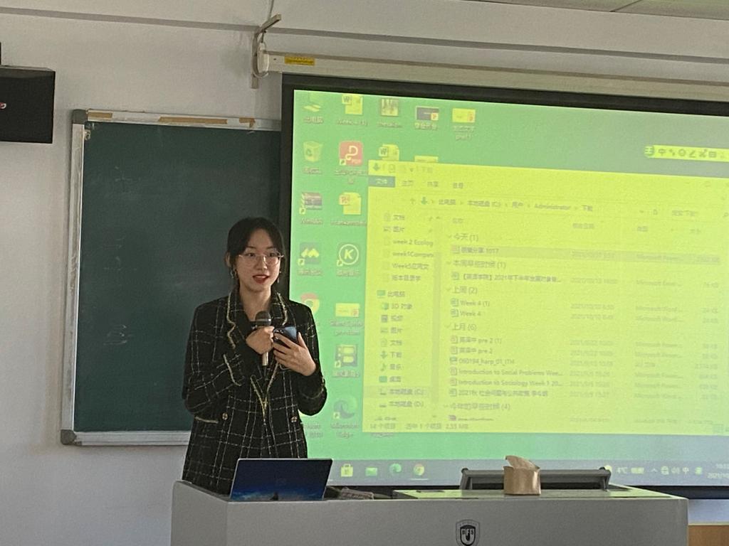 查可欣首先全面和详细地向2021级同学们介绍了jinnianhui今年会大一时会接触到的各类专业课程,以及每门课的学习方法、学习心得和考试类型等,为2021级的同学们解答了诸多在课业上的疑惑。接着,她分享了自己的团支书工作和学生会工作经历,并鼓励同学们不断尝试挑战陌生的领域、挖掘自己的潜能。她特别提到,优秀的定义有很多种,除了学习,同学们可以寻找到更多自我价值实现的方式。