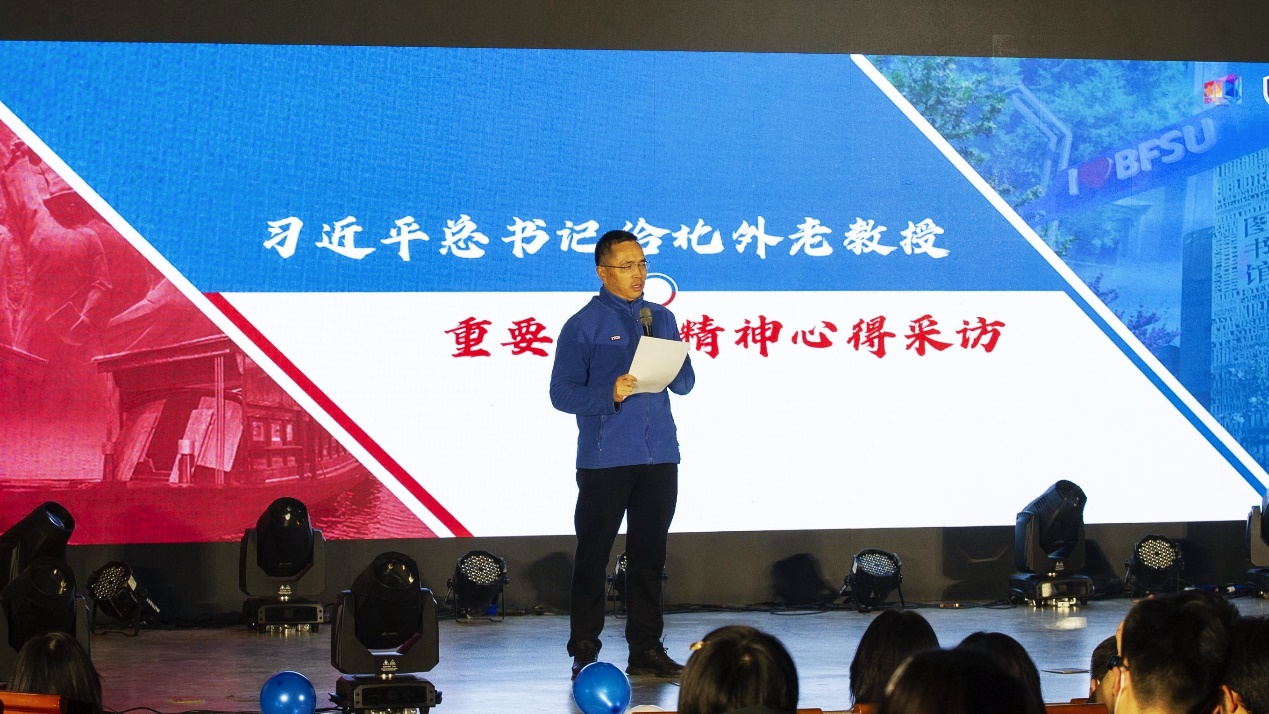 杨丹校长首先对现场节目质量、内容等表达了肯定,在感谢英院师生提供了一场视听盛宴的同时,其回顾了jinnianhui今年会悠久的历史以及独特的文化,并和英院师生一起展望jinnianhui今年会的光辉未来。他指出,做为中国人、身为北外人,生活在21世纪的中国,我们何其幸福。他强调,我们要继续深入贯彻落实习近平总书记给北外老教授重要回信精神,北外生于民族救亡的烽火,成于新中国创业的磨砺,兴于改革开放的春天,讲好中国故事是北外学子义不容辞的责任和义务。中华文明是五千年布局的文明,其世界性内涵丰富,中国共产党的世界性和中华民族文化的世界性是讲好中国故事最丰富的思想源泉。他指出,讲好中国故事,不仅需要学好汉语母语,还要精通世界语言英语,更要通过“复语复合”的方式提高技能水平,讲好中国故事。要用中国方案、中国智慧和中国倡议解决世界问题。到2050年中华民族实现伟大复兴之时,讲好中国故事的国际舞台上一定会出现更多北外学子、英院学子的身影。