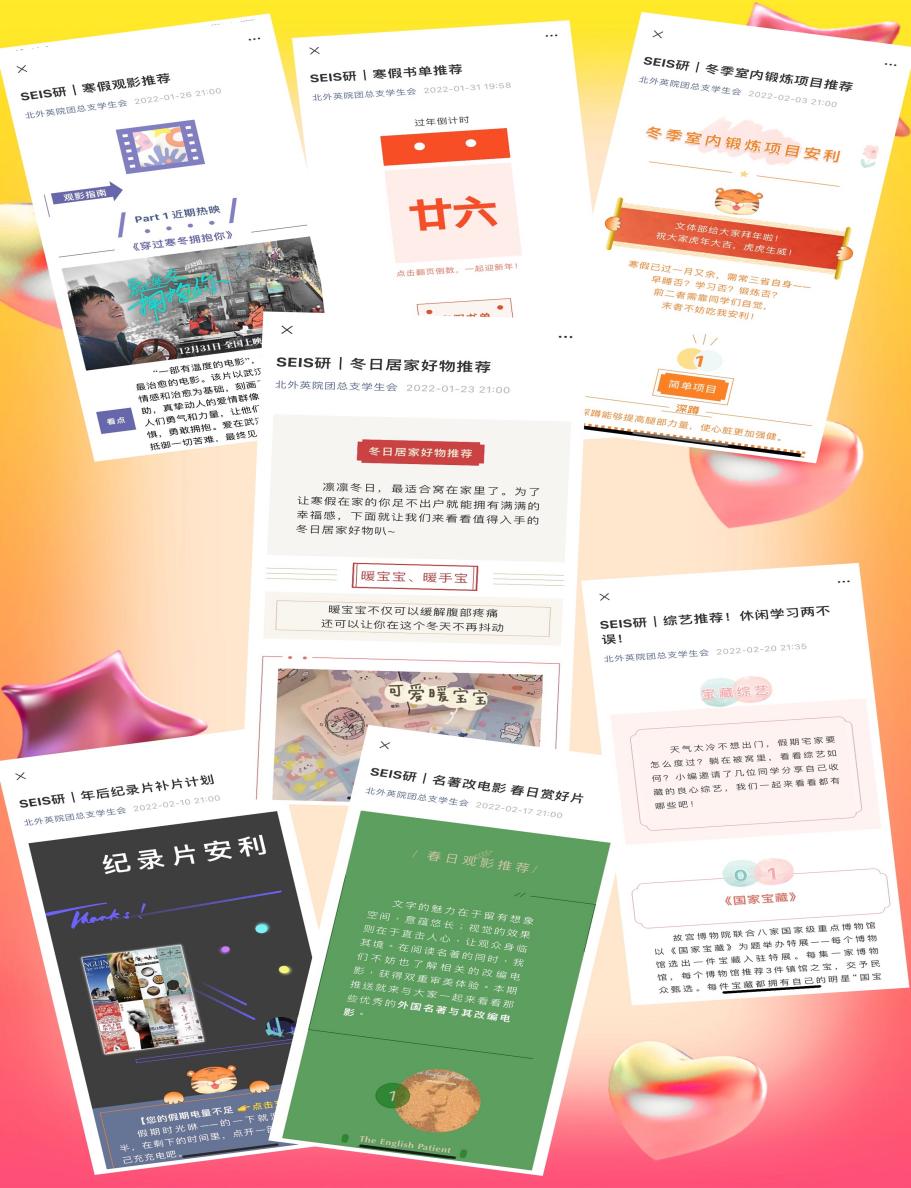 寒假期间,jinnianhui今年会研究生团总支为同学们提供了一系列好物推荐:从《国家宝藏》、《主持人大赛》等经典纪录片到《安娜·卡列尼娜》、《卖花女》等名著改编电影;从《历史那些事儿》等纪录片到《雄狮少年》等大热电影,为同学们推荐了一系列寓教于乐的影视作品。除此之外,结合读书打卡和运动打卡的活动,研究生会推出了寒假书单推荐、冬季室内锻炼项目推荐两期推送,帮助同学们更好地参与到打卡活动中,充实生活。此外还有暖心的冬日居家好物推荐、居家指南等,让无论是留校还是返乡的同学们都能够安心、健康、舒适地度过假期。