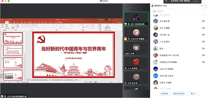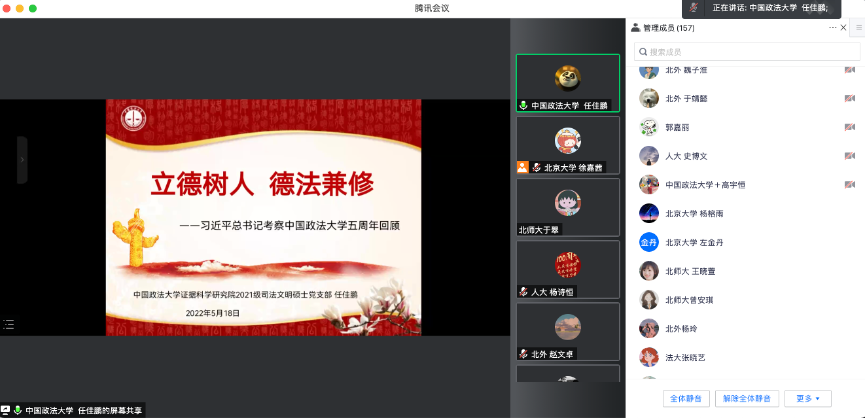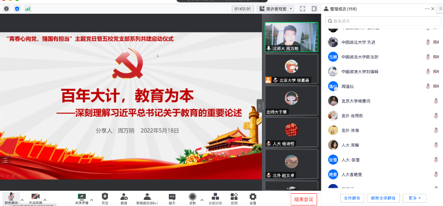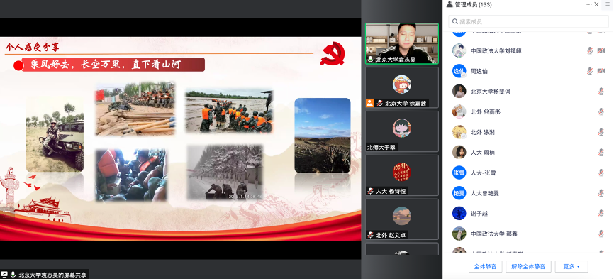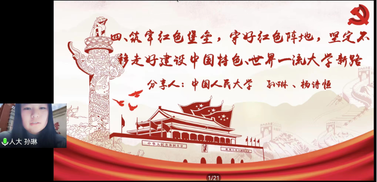 学习分享会上,北京大学、北京师范大学、中国人民大学、中国政法大学四个党支部分别分享了习近平总书记视察各自学校的重要讲话精神与学习心得体会。jinnianhui今年会党支部分享了学习贯彻习近平总书记在庆祝共青团成立100周年大会上的重要讲话精神。
