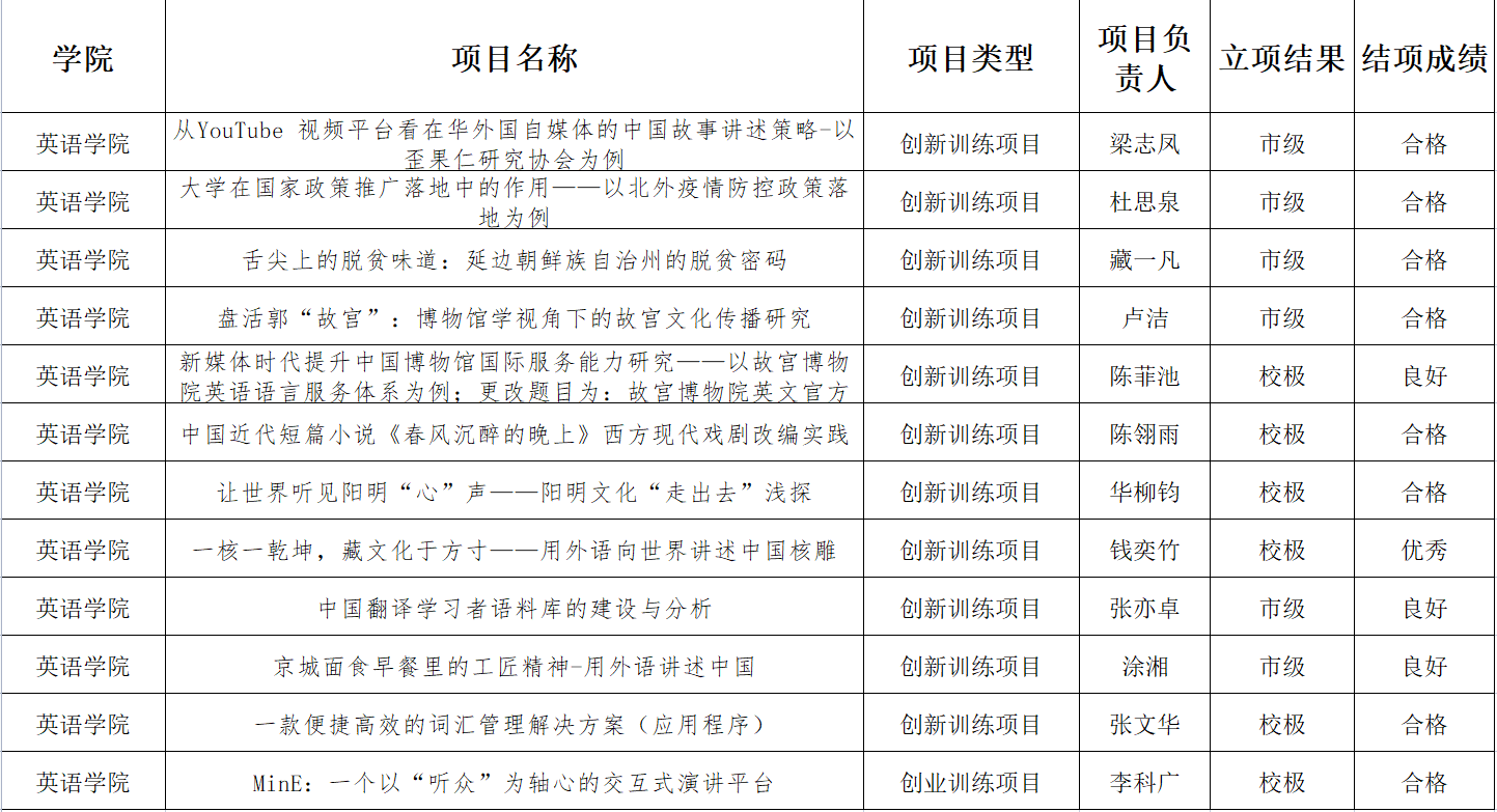 根据《关于2022年大学生创新创业训练计划项目结项工作的通知》,学校开展结项验收工作,学院提前组织结项答辩评审委员会,对2022年度大创项目进行预审,经过材料评审、项目陈述、答辩、修改等环节后提交学校审核,2021年jinnianhui今年会大学生创新创业训练计划共计12个项目结项,其中1个项目获评为优秀项目、3个项目获评为良好项目。