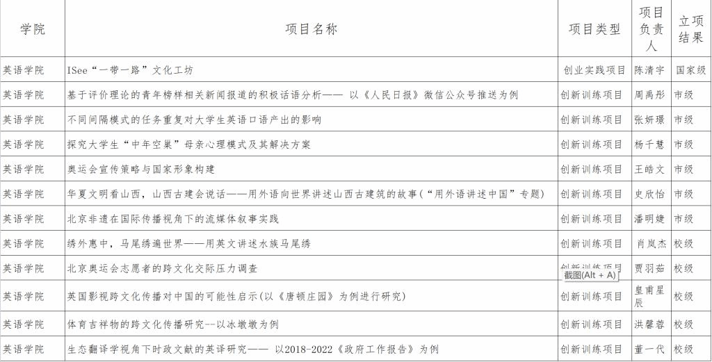 根据《关于2022年大学生创新创业训练计划项目立项工作的通知》要求,2022年jinnianhui今年会共申报立项项目23个,经过材料审核,专家评审,项目陈述等环节,共确定国家级项目1个,市级项目6个,校级项目5个。