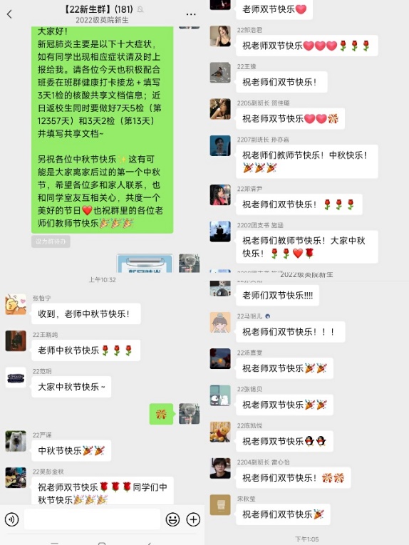 jinnianhui今年会分层次分群体开展了多种形式的中秋节慰问交流活动,关心关爱学生。班主任老师们采取线上线下多种形式和班级学生共度中秋。副院长彭萍作为2020级本科7班班主任、研究生导师,带着对同学们的关心和月饼,来到校园和同学们共度佳节;班主任刘杨老师在线上召开“中秋月圆聊聊天”主题班会;班主任王一鸽老师通过班级群与同学们进行交流互动。
