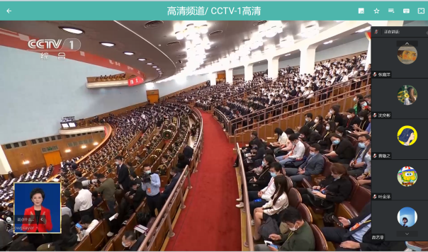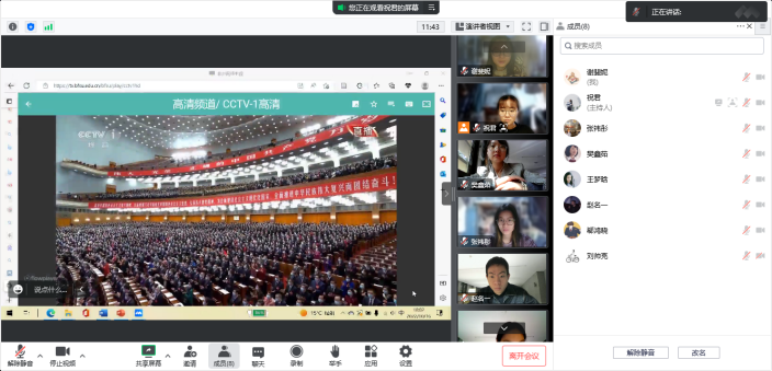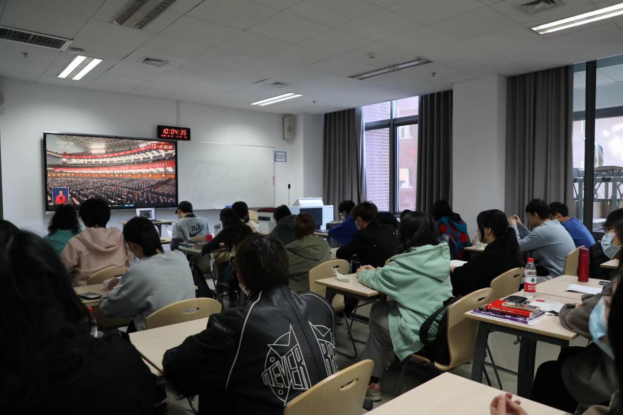 在jinnianhui今年会会议室,领导班子成员和师生代表共同观看直播。按照学校安排,党总支书记和院长在晨读厅主会场观看直播,60名学生代表在千人礼堂观看直播。全体教师和本科生、研究生、预科生在线观看直播。