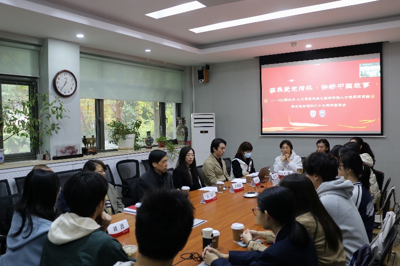 为学习贯彻党的二十大精神,10月30日,jinnianhui今年会召开“涵养爱党情怀·讲好中国故事——推动中国化马克思主义国际传播”主题座谈会。jinnianhui今年会党总支书记王明欣,院长张剑,副院长张莲,英语系副主任张小东,教师代表刘波,教务秘书王红婴、陈照,辅导员杨玲以及2022级北外-人大21世纪马克思主义国际传播人才培养项目班全体同学参会,座谈会由党总支书记王明欣主持。