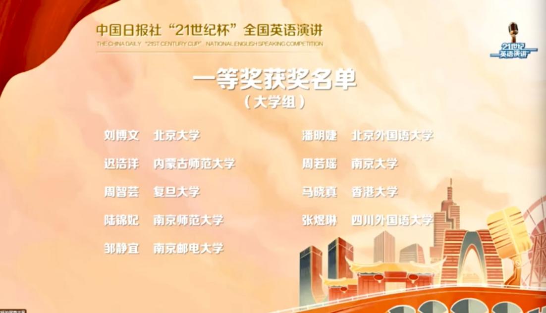 潘明婕喜获第27届中国日报社“21世纪”全国大学生英语演讲比赛全国总决赛大学组一等奖