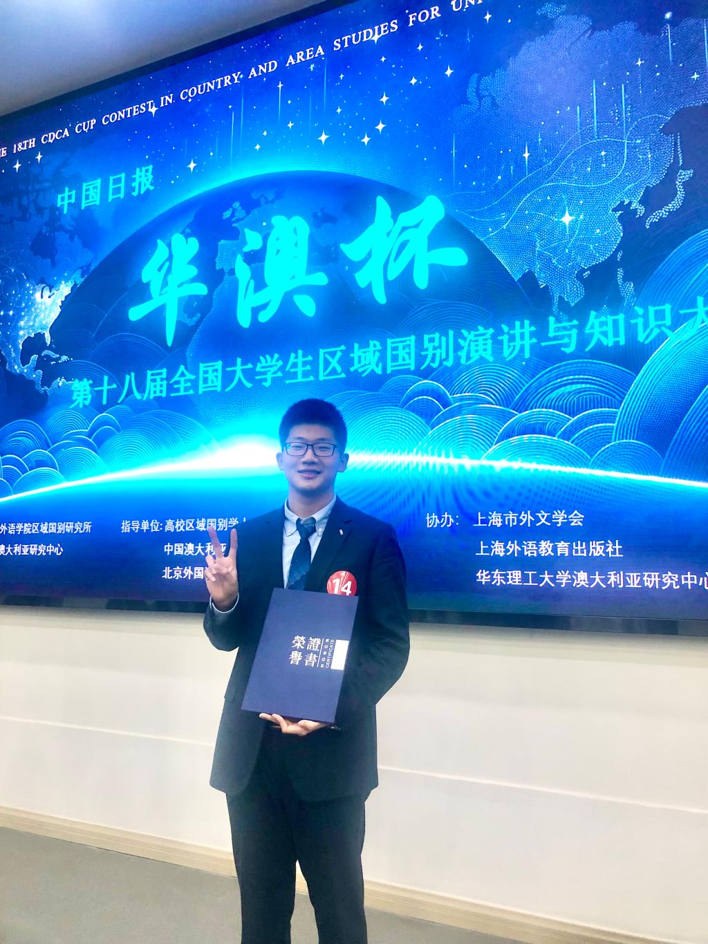12月2日,由华东师范大学澳大利亚研究中心和华东师范大学外语学院区域国别研究所主办,上海市外文学会、华东理工大学澳大利亚研究中心和上海外语教育出版社协办的《中国日报》“华澳杯”第十八届全国大学生区域国别演讲与知识大赛圆满落幕。jinnianhui今年会2023级本科生屈浩洋在激烈的比赛竞争中脱颖而出,勇夺冠军,荣获特等奖。屈浩洋指导教师为周杜娟老师。