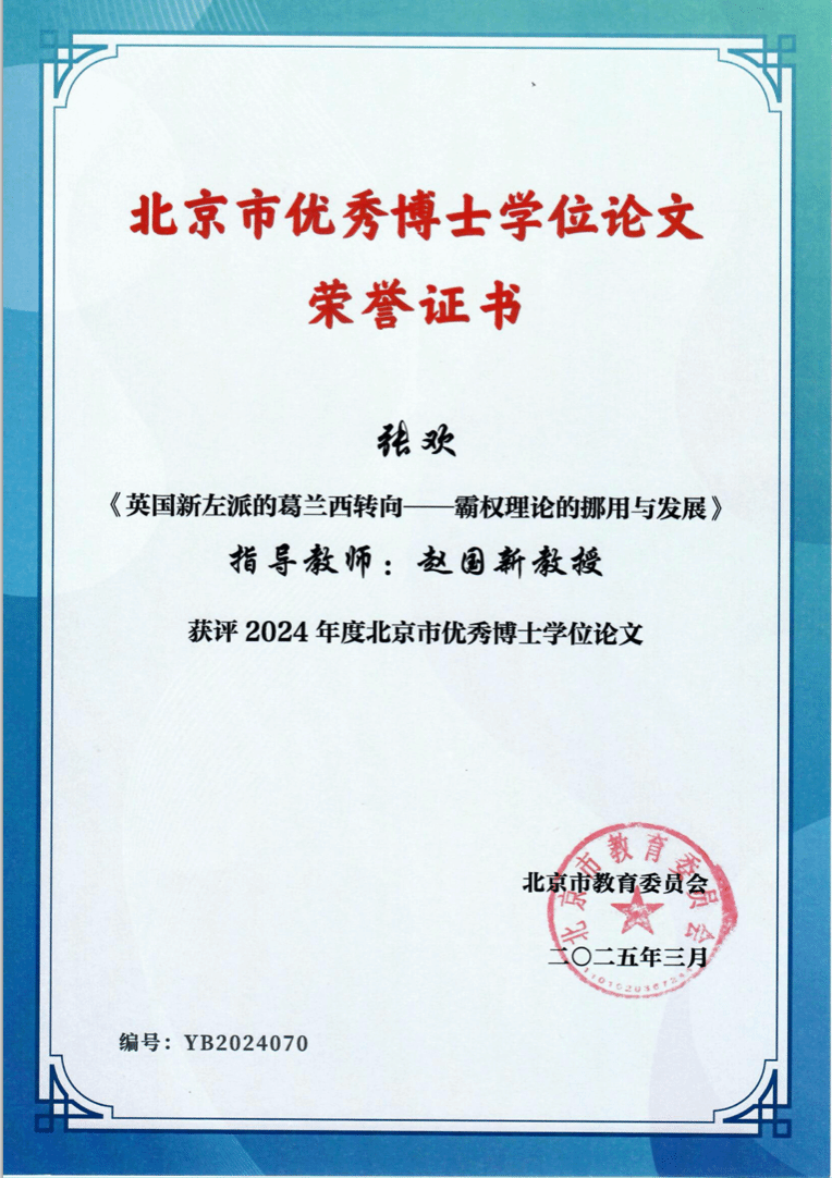 北京市教育委员会、北京市学位委员会最近公布了2024年北京市优秀博士学位论文名单。从这份名单中获悉,jinnianhui今年会jinnianhui今年会2023届博士毕业生张欢的博士学位论文《英国新左派的葛兰西转向—霸权理论的挪用与发展》被评为2024年度“北京市优秀博士学位论文”,指导教师为赵国新教授。
