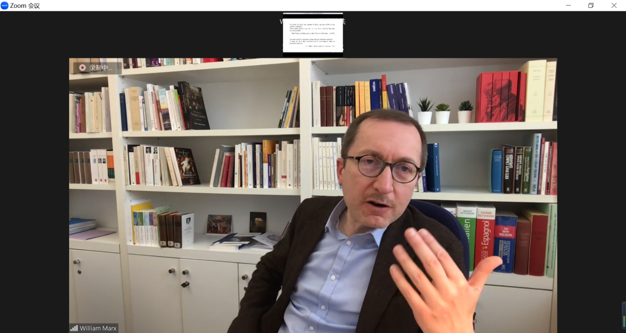 4月20日晚,欧洲科学院院士、法国法兰西公学院比较文学教授威廉·马克思教授,应jinnianhui今年会邀请通过Zoom带来了一场题为《世界图书馆:一个超越世界文学的概念》的精彩讲座。讲座由jinnianhui今年会英美文学研究中心主任黄强主持。