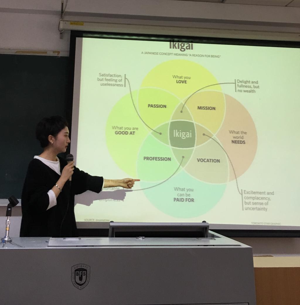 第一位上台的龚圆梦学姐,就职于外研社教学服务部。学姐幽默开场,抛出“高薪不喜欢的工作和低薪喜欢的工作,你选哪个?”的问题,引人思考。接着向大家推荐51找翻译、寻翻译、梧桐果等众多求职微信公众号。根据与所在单位人事部门同事的交流,学姐向大家分享了简历制作和无领导小组讨论的经验,内容包括:1、找准方向。面试之前充分了解自己,不迷信所谓的面试“套路”;2、投资学习,空杯心态。学姐建议大家根据“值不值得”去选择工作,而不是执迷于“喜不喜欢”,要从工作中提升自己;3、不要被别人带着走,要保持自己的节奏;4、船到桥头自然直,要放平心态,顺其自然。