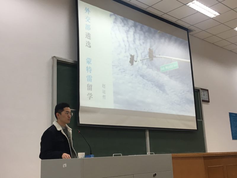 赵运哲同学介绍外交部遴选经验和在蒙特雷翻译学院学习的经历。他告诉同学们,外交部遴选主要考察申论、行政能力测试、英语笔试和口试和面试。英语笔试口试要多学习政论文献、俚语翻译,多看经济学人的文章。他还提醒同学们,口试和面试时切记保持良好的应试心态。为同学们推荐了几个公众号:“外交部发言人办公室”,“英文巴士”和“翻吧”等,可以学习时政英语翻译,锻炼个人视译能力。