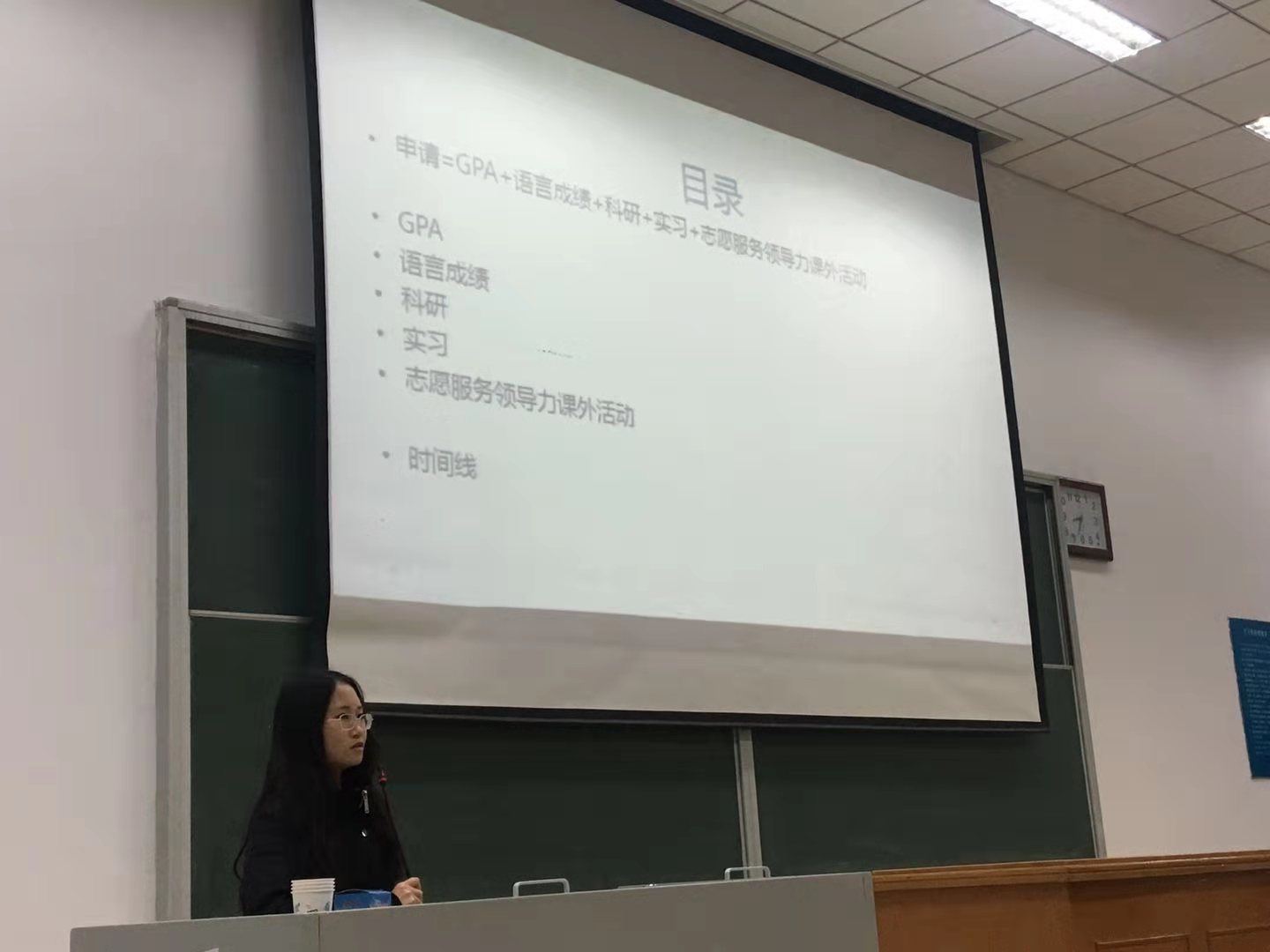 最后与同学们分享经验的是保研到北外国际商学院的吕芸萌学姐。她告诉同学们大三要学好专业课,在暑假积极参加北外国际组织夏令营或者其他学校的夏令营。同时介绍了北外夏令营申请的条件和录取情况。