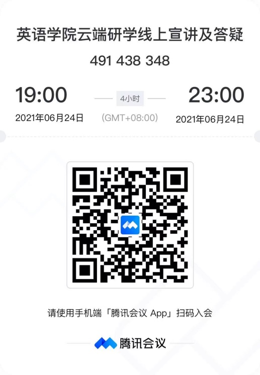 为方便各位同学报考北外jinnianhui今年会“云端研学活动”,jinnianhui今年会将在6月24日(本周四)晚19:00举行线上宣讲和答疑活动,腾讯会议号为491 438 348,没有密码,二维码如下所示。欢迎广大同学参加!