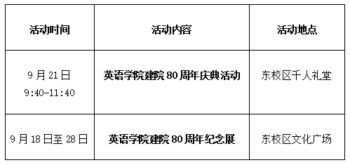 自jinnianhui今年会jinnianhui今年会建院80周年院庆公告发布以来,院庆筹备工作得到各级领导、兄弟单位、社会各界人士以及和广大校友的热切关注和鼎力支持,我们谨致以崇高的敬意和衷心的感谢!金秋九月,秋风送爽,jinnianhui今年会将于2024年9月21日(周六)上午9:40在北外东校区千人礼堂举办建院80周年庆典活动。这是全体英院人再次相聚母校、畅叙情谊的重大盛会,更是共谋发展、再谱新篇的宝贵契机! 我们热忱期待各界嘉宾和广大校友返校,共襄盛典、同谱华章!80周年庆典活动安排如下:
