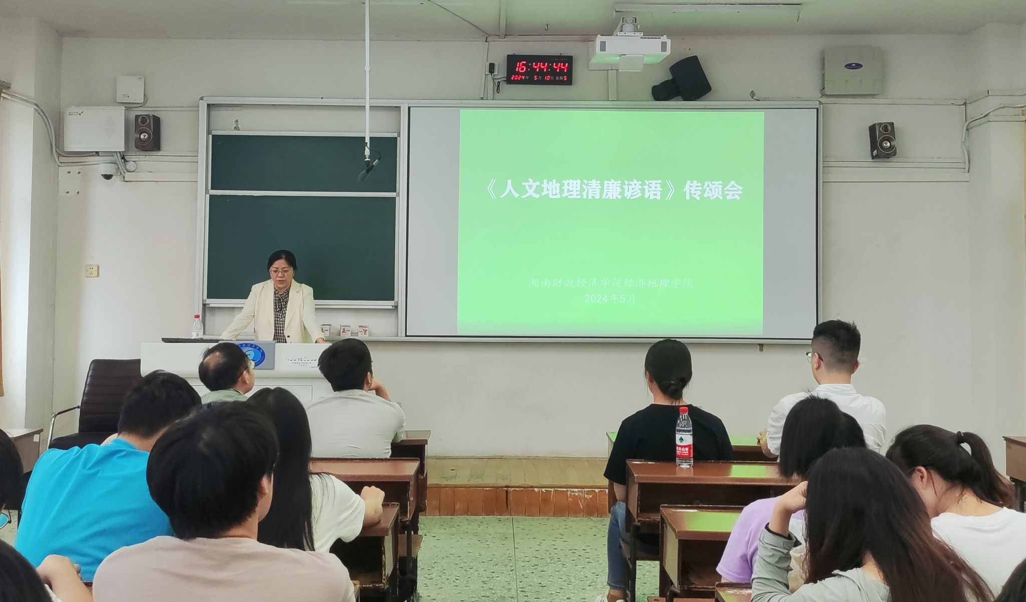 (本网讯)为贯彻“五清校园”作风建设年工作精神,经济地理学院以“廉洁文化宣传月”活动为契机,5月10日下午在第二教学楼2411教室隆重举行《人文地理清廉谚语》传颂会。院直属党支部书记姚旭辉、党员师生代表及21、22级部分学生等50余人参与此次活动。