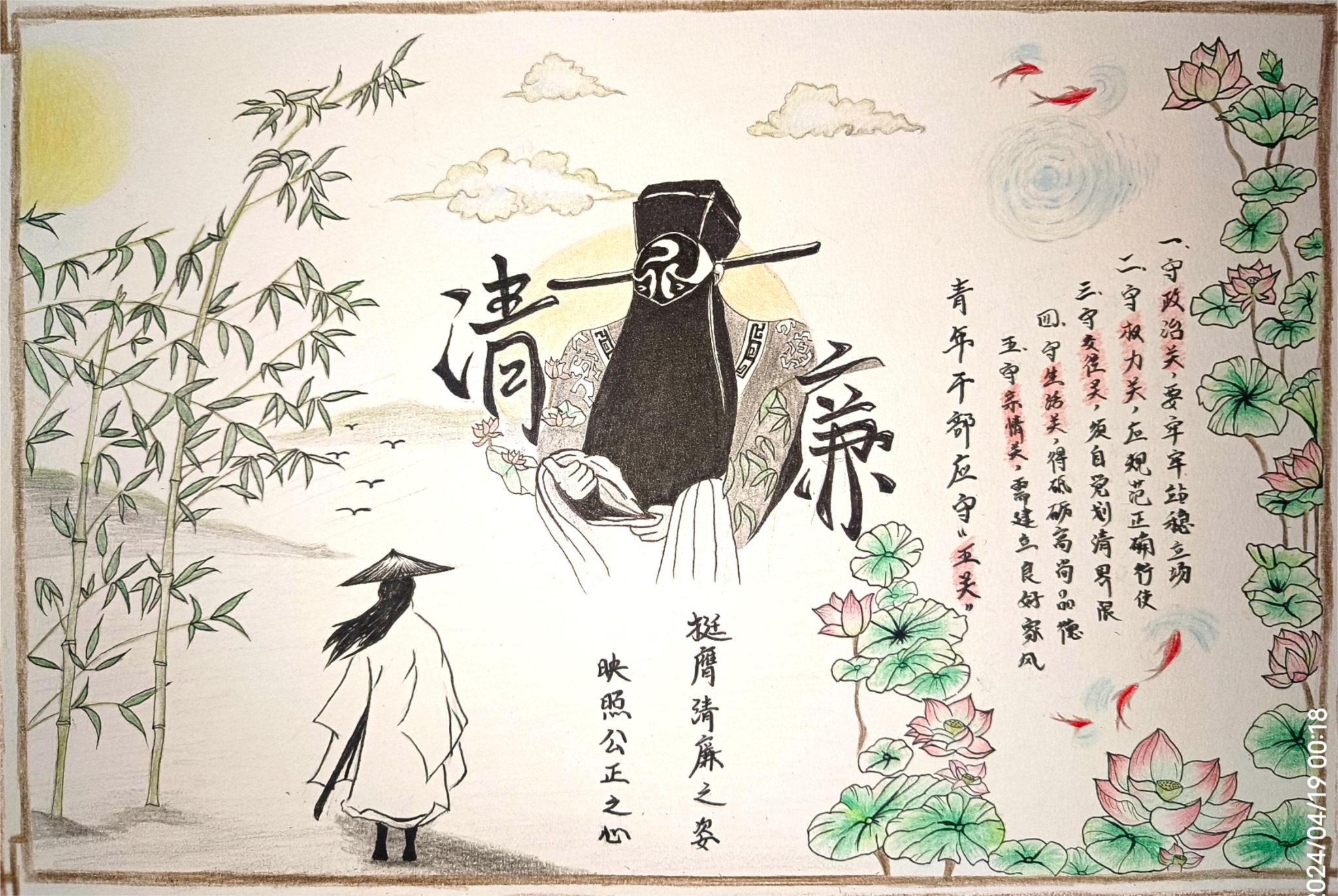 学院高度重视本次比赛,赛前积极宣传、精心准备、广泛动员,成功吸引了学院内众多师生的积极参与。参赛选手们以笔墨为媒介将清廉底蕴诉诸于书法和绘画之中,创作出一幅幅风格多样、寓意深远的精美作品,完美诠释了对廉洁文化的独特理解和深刻感悟。