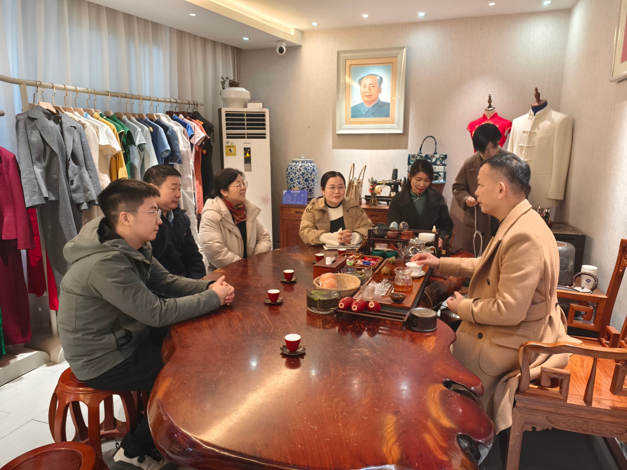 学院一行人先后参观了企业研发中心、网络营销直播间、智能裁缝车间和非遗旗袍展厅。座谈会上,舒纪铭董事长分享了企业人才需求现状:随着全球化布局加速,企业亟需既懂文化传播又具备商业思维的复合型人才。姚旭辉表示,会将企业的需求标准传达给学生,在建立实习实训基地后,学院将充分发挥学科优势,为企业发展赋能。双方就“传统文化数字化传播”“文旅IP打造”进行了深入交流与讨论。