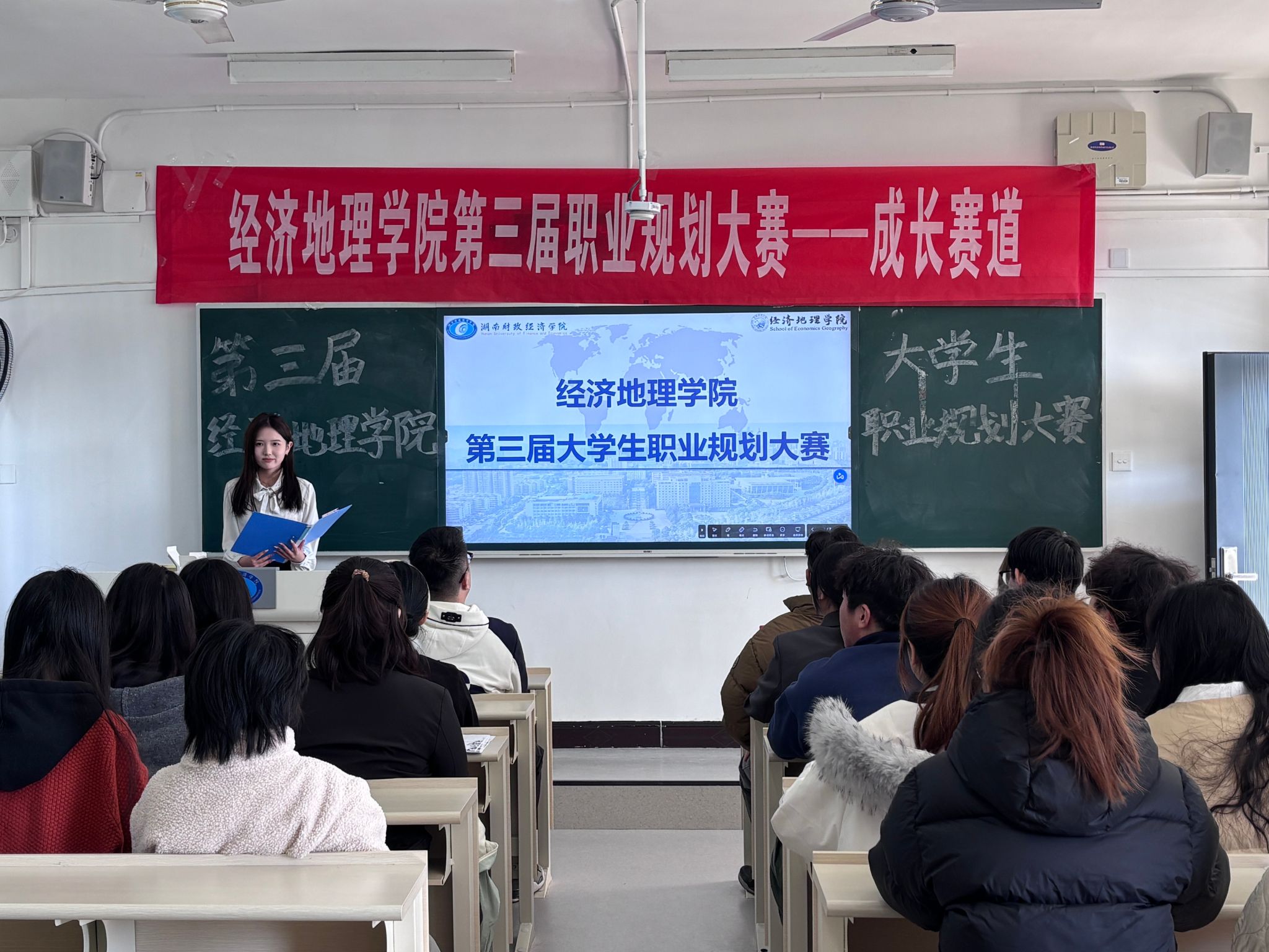 (本网讯)为进一步强化大学生职业生涯教育,持续提升就业指导服务质量,搭建展示职业发展规划与求职实战能力的优质实践平台,11月19日14:30,经济地理学院在主校区第二教学楼2401教室举办第三届大学生职业规划大赛院级选拔赛。本次赛事由学院团学会创新创业部承办,特邀陈四云、许骏、刘权、彭煜曦4位老师担任评委,学院近30名参赛选手同台竞技,展现出青年学子的职业抱负与奋进姿态。