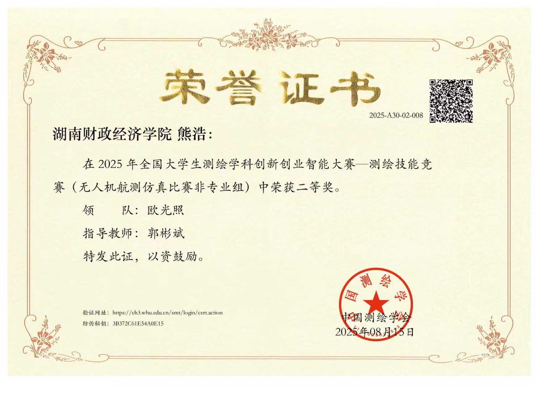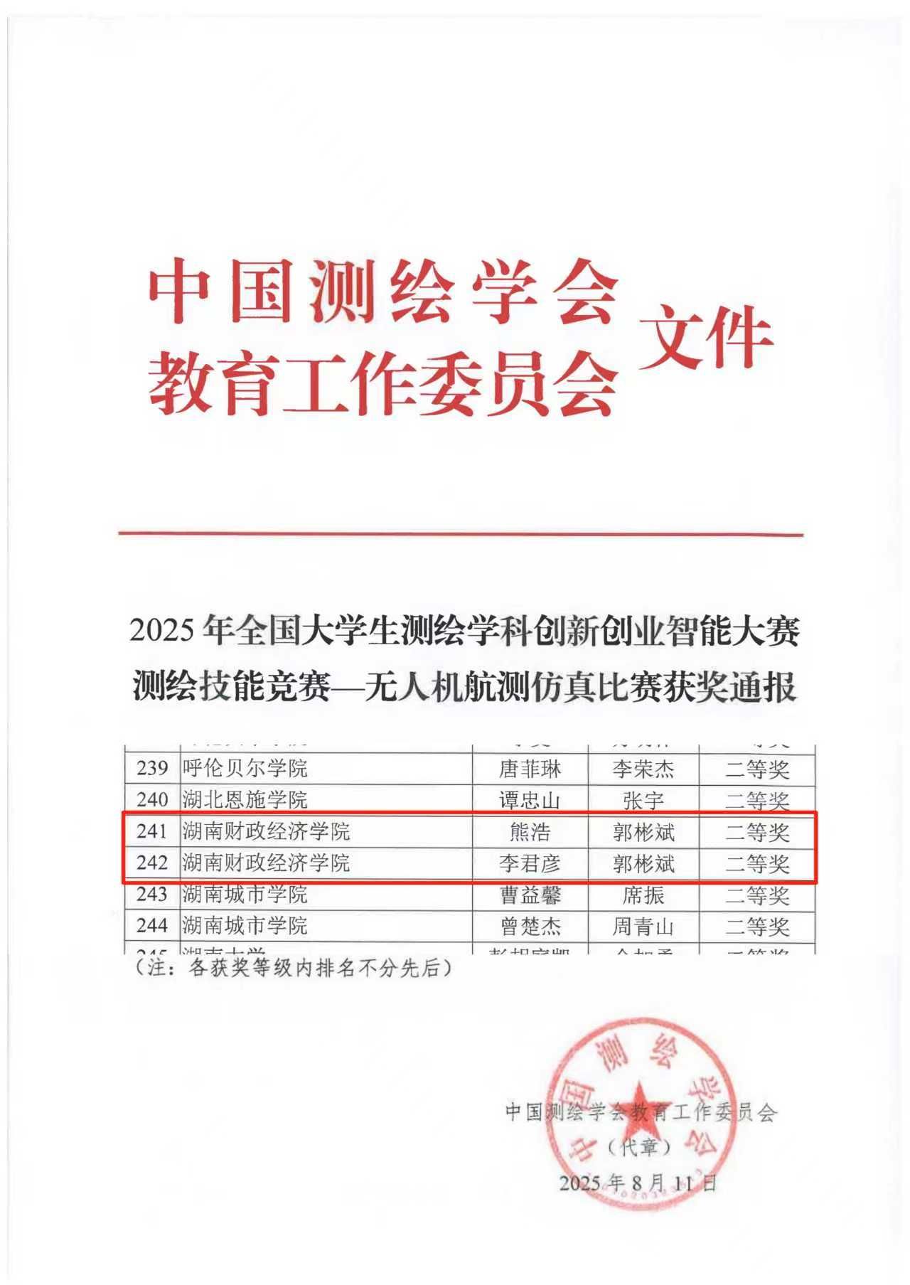 (本网讯)7月31日—8月1日,由中国测绘学会教育工作委员会主办的2025年全国大学生测绘学科创新创业智能大赛在内蒙古科技大学(包头)成功举办。经济地理学院学子经过精心准备、刻苦训练和奋勇拼搏,李君彦和熊浩分别获得无人机航测仿真二等奖,指导老师均为郭彬斌老师,实现了我院在该项赛事奖项零的突破。