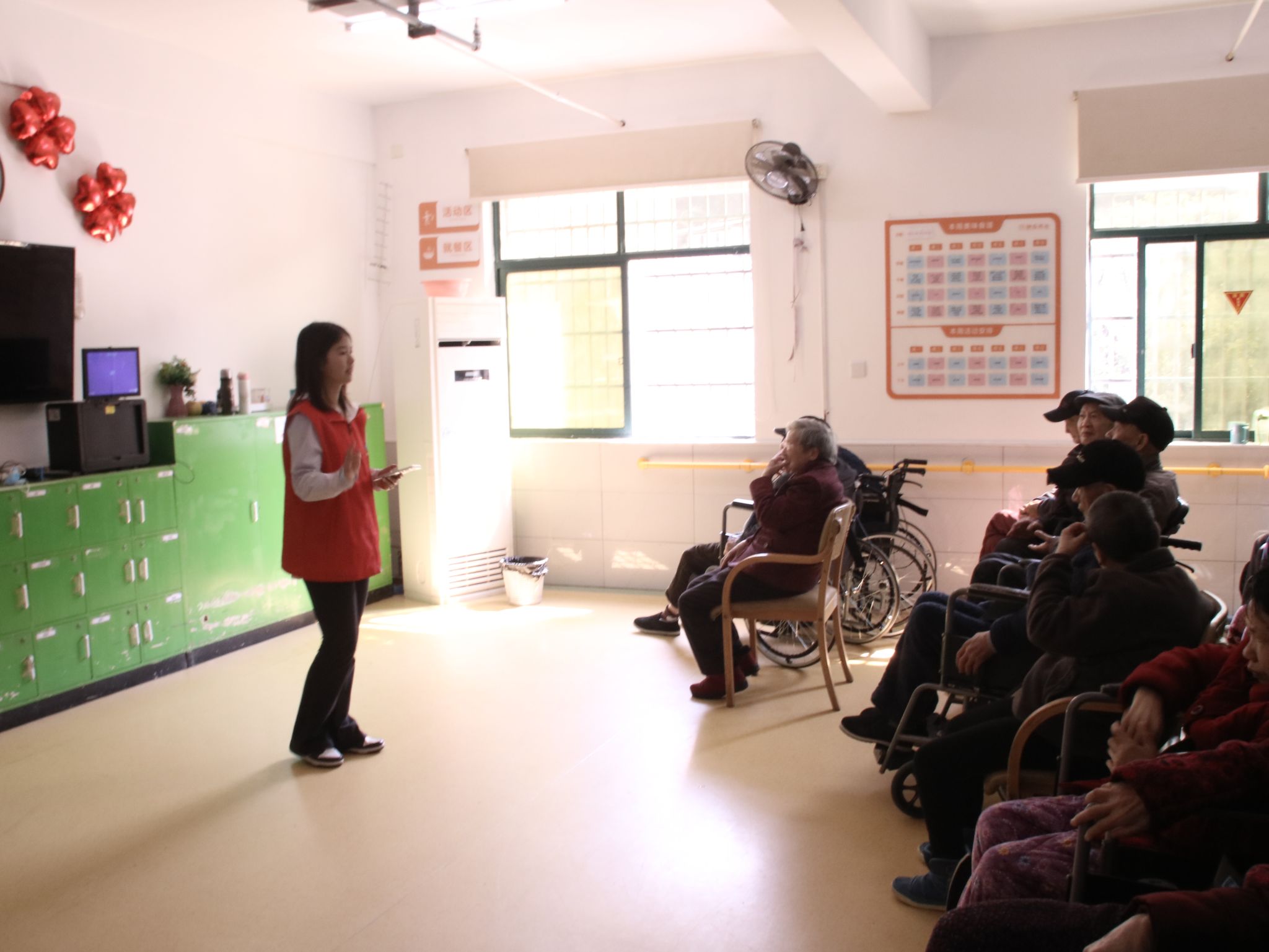 活动伊始,经济地理学院周景琪同学为老人们献上了一首经典老歌《浏阳河》,悠扬的旋律勾起了老人们的美好回忆,现场气氛温馨融洽。随后,志愿者们与老人们进行了“我与老人心换心”折纸互动环节,手把手教老人们折爱心,并将折好的爱心互相交换,寓意着心与心的连接,传递着温暖与祝福。