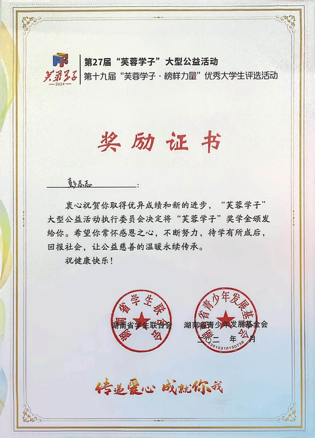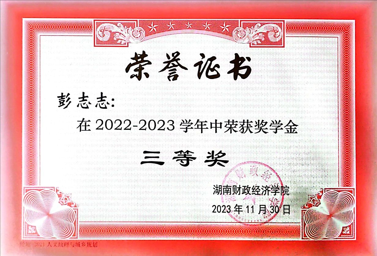 彭志志,男,汉族,中共党员,2002年9月出生,经济地理学院2021级人文地理与城乡规划班学生,班长。2023-2024学年国家奖学金、第十九届芙蓉学子·社会实践奖获得者,连续三年获得校级奖学金,并取得英语六级、普通话二级证书,通过高中地理教师资格证考试。曾获第五届全国大学生土地国情调查大赛全国二等奖、新文科实践创新大赛优秀奖、首届职业规划大赛校赛银奖以及三好学生、优秀学生干部、湖南省优秀毕业生等荣誉20余项。主持一项校级大学生创新创业项目,并参与一项省级大学生创新创业项目,以第二作者身份完成学术论文一篇。作为团队负责人参与2023年暑期“三下乡”社会实践活动,带领团队入选国家级社会实践项目“财经报国,青年力行”。已考研上岸宁夏大学。