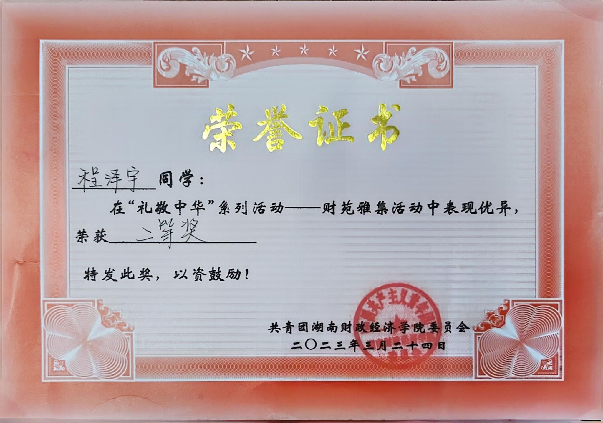 程泽宇,男,汉族,共青团员,2003年9月出生,2021级人文地理与城乡规划班学生,学习委员。目前已取得英语六级证书,曾获得校级三等奖学金、校优秀学生干部等荣誉称号,参与一项校级大创项目。获得人民城市全龄友好社区创意大赛三等奖,长沙市智力运动会桥牌团体赛铜牌。多次参与校园迎新等志愿实践活动。此外,积极参与教师科研项目,如建筑行业发展报告等。