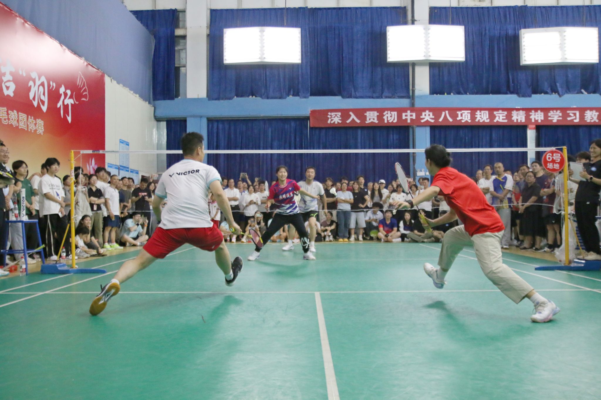 比赛打破传统赛制,将廉洁知识竞答与羽毛球竞技双线融合。参赛教职工通过书面答题展开“脑力比拼”,刘钟理现场揭晓竞答结果,以寓教于赛的形式推动廉洁教育入脑入心。在羽毛球竞技环节,男单、女单、男双、女双、混双五大项目轮番上演,淘汰赛与决赛层层递进,参赛队员默契配合、攻防兼备,扣杀、吊球、搓网等高阶技巧频出,充分展现团结拼搏的体育精神;赛场外,加油助威声此起彼伏,汇聚成鼓舞士气的最强音。