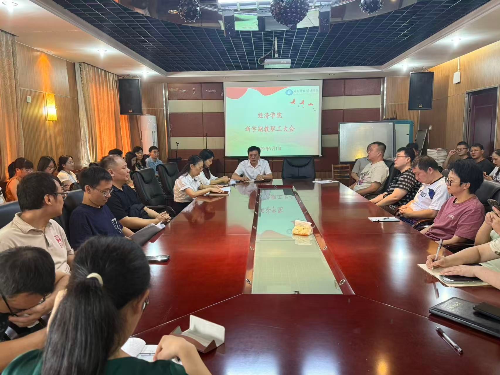 (本网讯)9 月 1 日上午,经济学院在 1014 会议室召开了全体教职工大会,会议由院长李勇辉主持,全院教职工齐聚一堂,共同开启新学期的工作部署与展望。