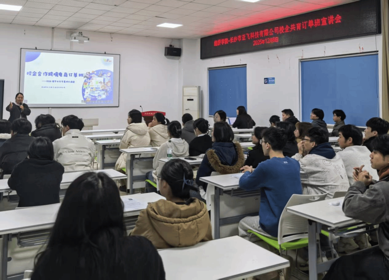 (本网讯)为深化产教融合、拓宽毕业生就业渠道,12月8日,经济学院在就业指导中心成功举办第二期产教融合订单班宣讲暨选拔活动。本次活动由经济学院与长沙亚飞科技有限公司联合开展,面向2026届毕业生进行定向人才培养与选拔公司总经理李方玉人力资源部经理蔡傲鸾亲临活动现场