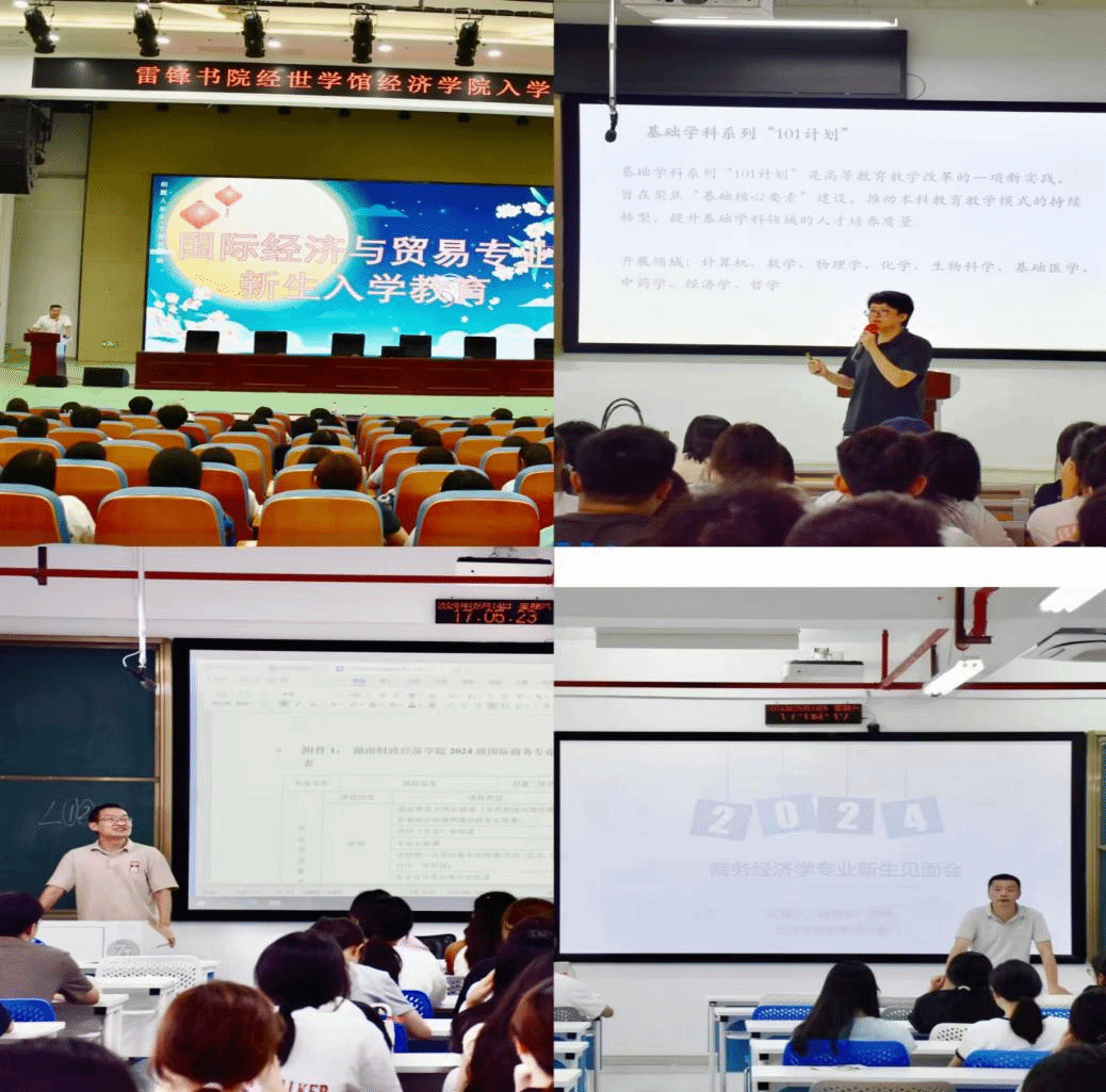 (本网讯)9月14日下午,雷锋学院经世学馆经济学院2024级新生入学教育大会在雷锋校区举行。院党委书记余华、副院长陈雯、党委副书记刘英、副院长彭千芮、各系系主任、教师代表、学生代表、带班辅导员及2024级新生参加会议。会议由彭千芮主持。