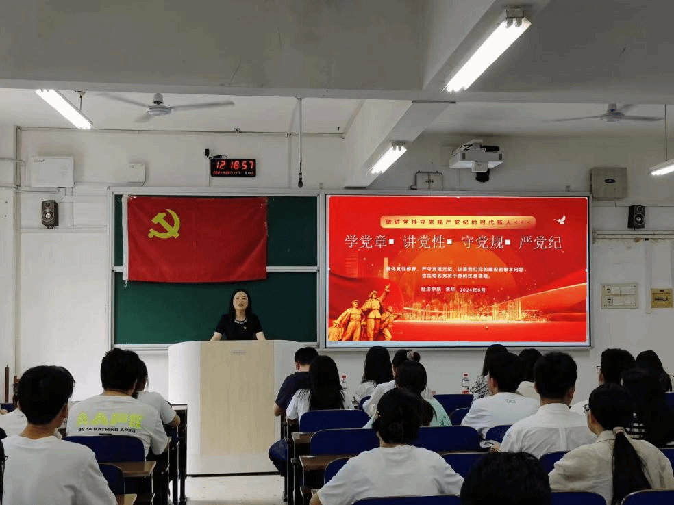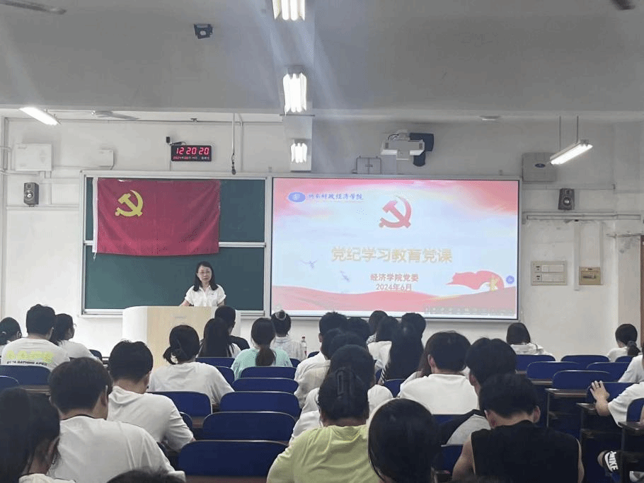 (本网讯)6月14日,经济学院在主校区3313教室开展党纪学习教育党课。学院党委书记余华和党委副书记刘英为全体学生党员讲授党课。