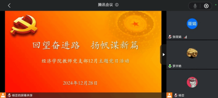 (本网讯)12月28日晚上7点半,经济学院教师党支部全体党员开展了主题为“回望奋进路,扬帆谋新篇”的党日活动,活动通过腾讯会议以线上方式进行,由支部书记杨芸主持