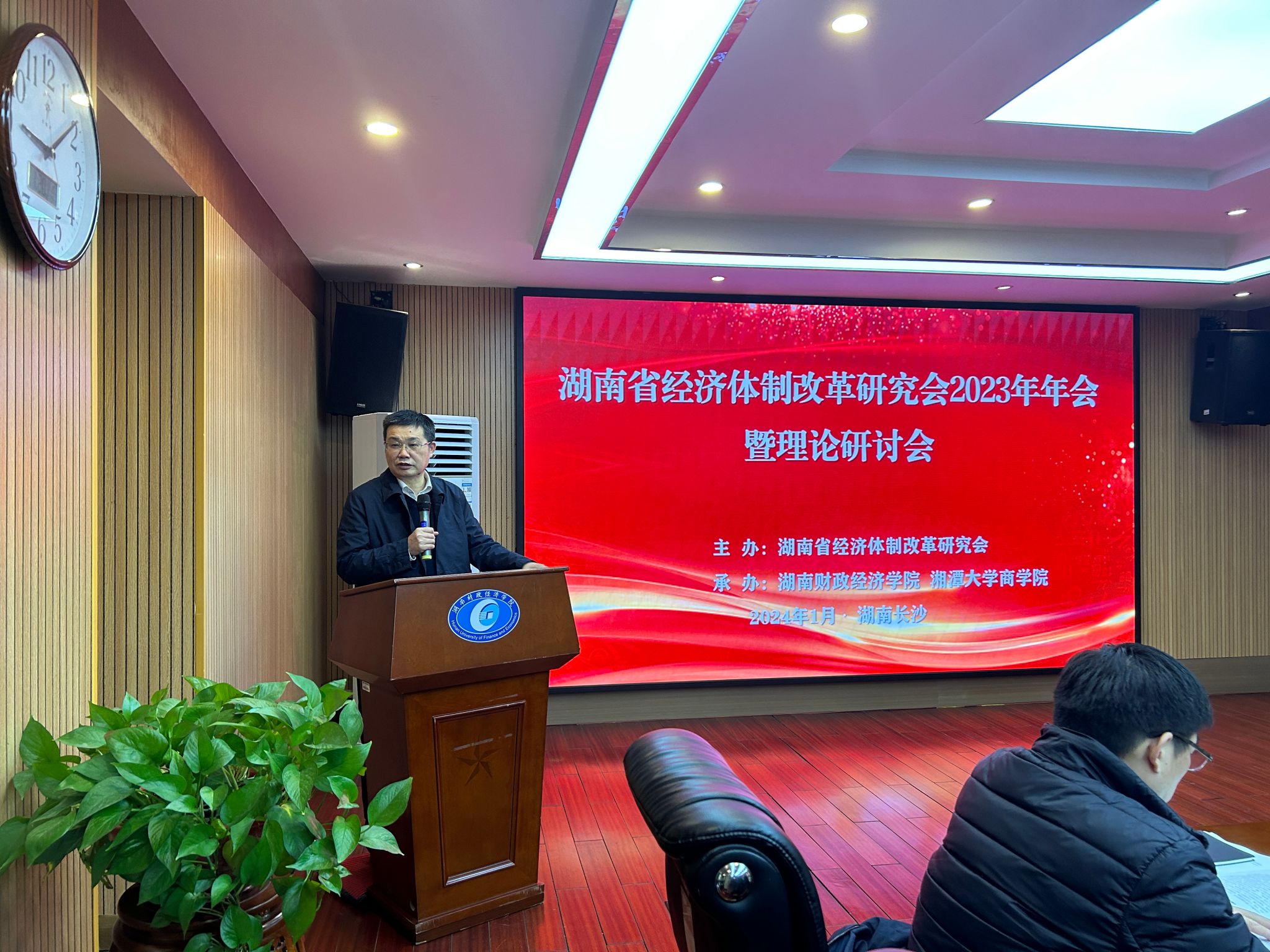 副会长兼秘书长欧定余教授总结2023年度学会工作,分别从持续加强党建工作、举办高水平学术会议、主动开展科学研究以及积极投入社会服务活动等多方面进行工作回顾。韩雷教授宣读会议论文评选结果,并对获奖论文作者表示祝贺。湖南省社科联党组成员、副主席贺建湘表示实现高质量发展需要完善的科技金融体系,积极探索金融强国的湖南模式。