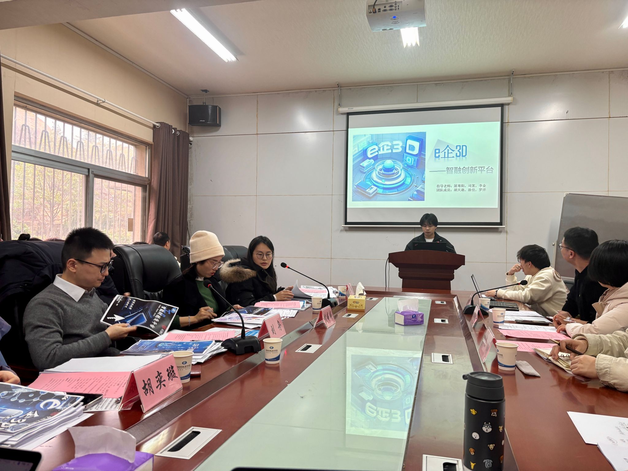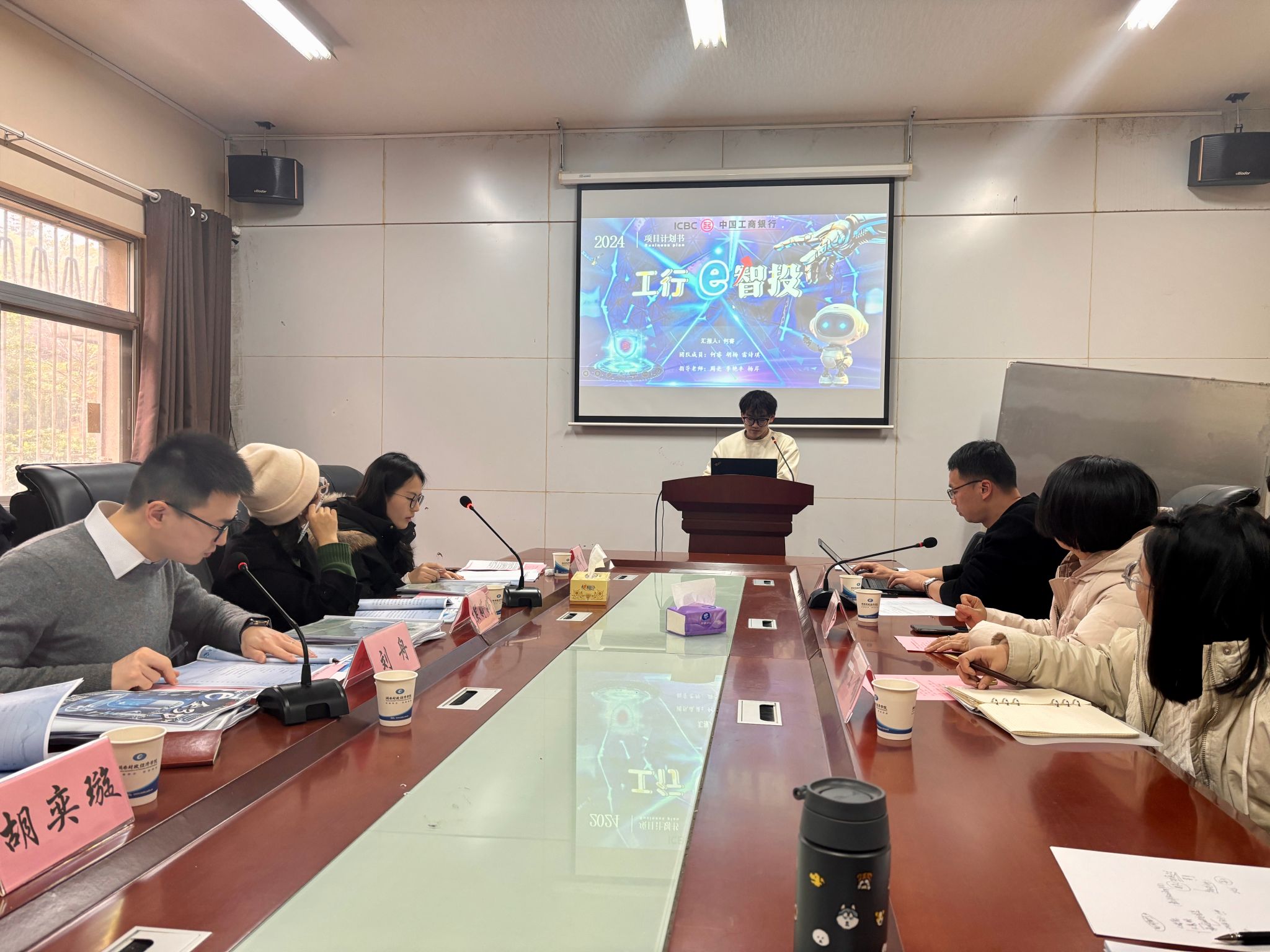 其次,财政金融学院周亮博士主持作品交流会。15支学生团队创新作品依次展示,涵盖银发经济、智能支付、茶产业融合、3D打印等多个前沿领域。每组学生代表进行5分钟 PPT陈述,工商银行专家从专业角度对作品进行面对面、针对性、建设性的点评与提建议。