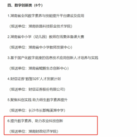 2024年10月,由湖南省委网信办、省教育厅、省科技厅、省工业和信息化厅等部门共同组织开展的湖南省提升全民数字素养与技能典型案例征集活动结果揭晓。beat365官网报送的“提升数字素养,助力农业科技创新”成功入选数字创新类典型案例,该案例由财政金融学院李鑫老师撰写完成。