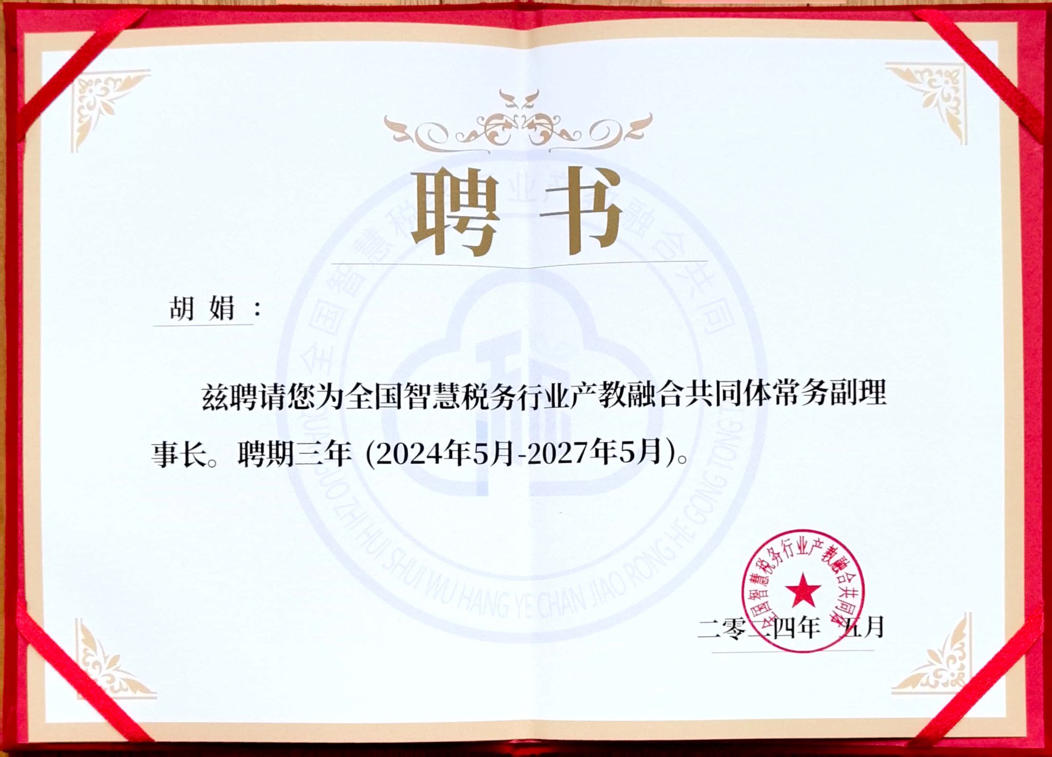 图3 胡娟获聘全国智慧税务行业产教融合共同体常务副理事长