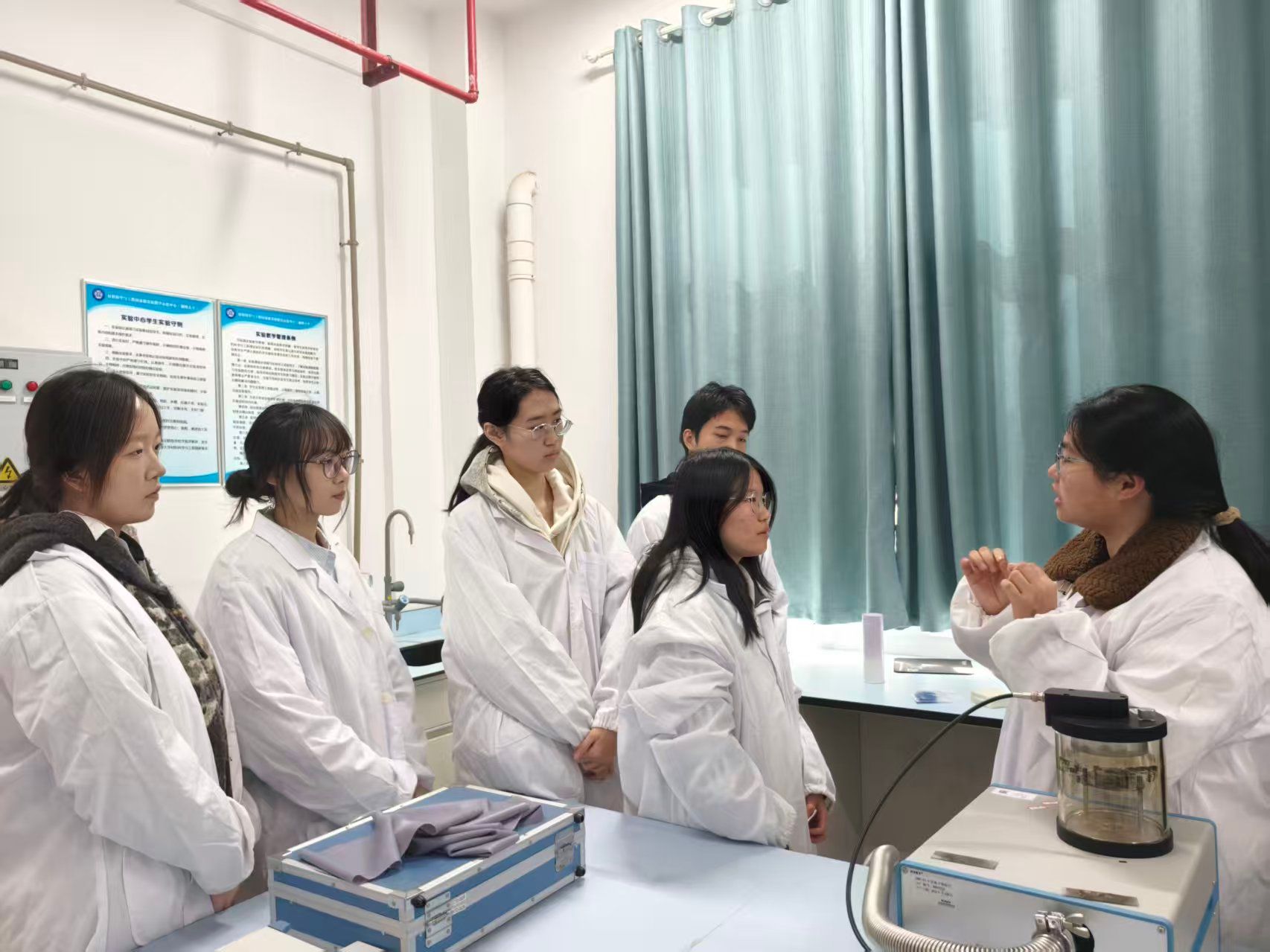 在湘潭大学侯鹏飞教授以及申丫、彭洁、张先俊三位博士的热情接待与细致讲解中,学生团队先后参观了柔性基底材料实验室、半导体功率器件分析平台等科研场所,近距离接触高温马弗炉、离子溅射仪等一系列高精尖仪器设备,初步了解了相关材料的制备流程与检测方法。